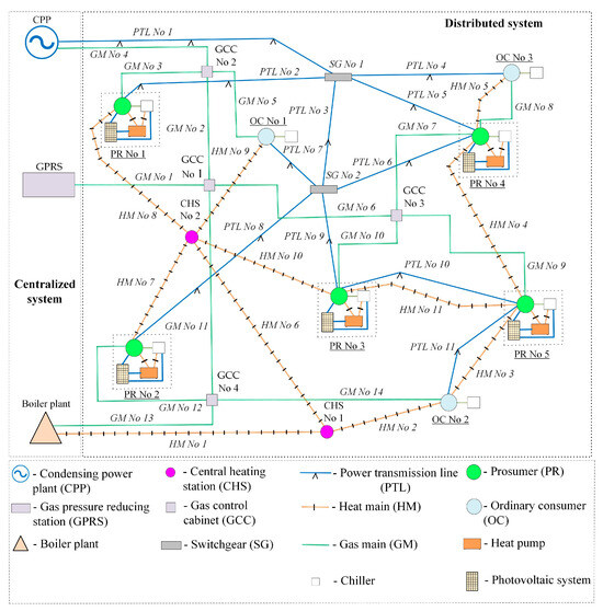 Recent energy trends clearly gravitate towards energy transition, or the transformation of energy systems under the banner of the three Ds: decarbonization, digitalization, and decentralization [1]. Decentralization of energy systems, backed by modern technology (highly efficient energy sources of the latest generations, energy-saving automatic control systems, highly sensitive state-of-the-art devices, and sensors for tracking system parameters, etc.), will allow for meeting the needs of different levels of consumers, including prosumers, who will be able to choose the most efficient and cost-effective energy sources for themselves. This, in turn, will ensure better quality energy supply, which takes into account the interests of all entities involved in the energy system. In this regard, the expansion of centralized energy supply in developed countries is accompanied by the increasingly established trend of large-scale development of distributed energy generation systems [2,3], which allows prosumers to become involved in their energy supply, including by supplying energy back to the system. Consequently, competition between centralized and decentralized energy supply, on the one hand, and between large-scale and distributed power generation, on the other hand, becomes much tighter. This calls for the use of new approaches to forming energy systems and managing centralized and distributed energy sources so as to find the optimal balance between them.