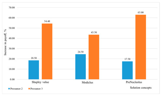 The issues of interaction and cooperation between consumers within a distributed system have become the subject of a lively discussion after the publication of Ref. [22], which considered the case of cooperation that led to disconnection from the centralized power supply. The efficient organization of the industry should also take into account such possible effects. The study prioritized the application of cooperative game theory concepts that are capable of revealing the stability and efficiency of cooperation as well as the market power of the players [12]. Furthermore, these approaches take into account the gains from forming a coalition as compared to non-cooperative behavior [23]. The outcome of the cooperation is determined by the cooperative game solution chosen by the planner. The published research on forming coalitions of consumers within distributed systems most often reports the use of the Shapley value and related imputations [24] and, to a lesser extent, the Nucleolus [25]. The other concepts are not considered.