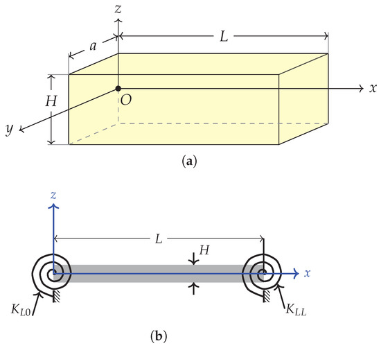 The beam has a uniform temperature of , an electric potential of , and a magnetic potential of . Using the Cartesian coordinate system, the beam is assumed to have a length L varies in a range of (0 ≤ x ≤ L), a width a varies in a range of (0 ≤ y ≤ a), and a thickness H varies in a range of (−H/2 ≤ z ≤ H/2), respectively, as illustrated in Figure 1. It is also subjected to bending vibrations with small amplitudes around the x-axis. The nature of the deflection of the beam follows the linear Euler–Bernoulli beam theory, which asserts that when bending occurs, any plane cross-section perpendicular to the beam axis remains plain and perpendicular to the neutral axis, and the bent beam slopes are also not too steep. Following these assumptions, we can express the mechanical displacements as [36,37]: