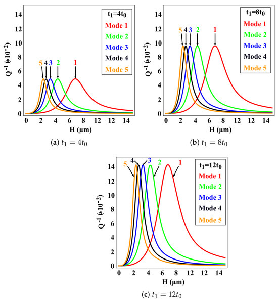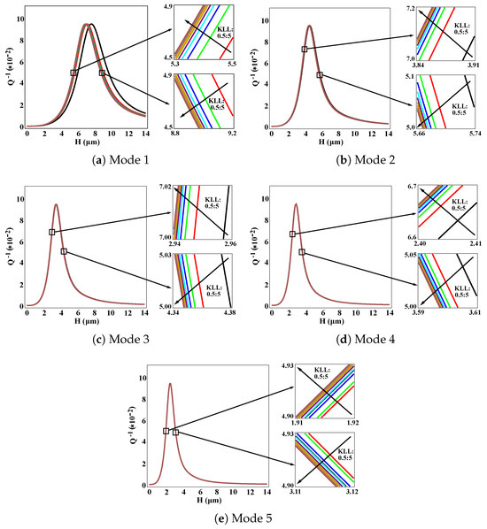 The variation of the TED () impacted by spring constant and mode shapes has been investigated. Figure 2 shows the variation of the influenced by spring constant of the beam taking into account a length of µm and time relaxation of . The results indicate that the TED is negligible as . The variation of keeps increasing as H increases until it reaches a peak value referred to as , as illustrated in Figure 2a–e for all mode shapes, respectively. Another observation was found where the value of the critical thickness decreases as the number of mode shape increases as shown in Figure 2. The results indicate that increasing the values of spring constant initially increases the thermoelastic damping .
