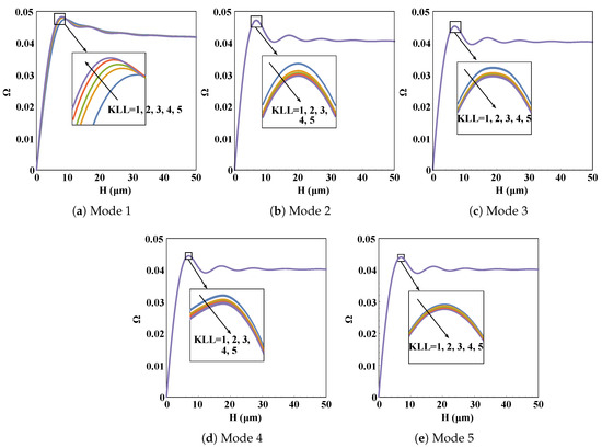 Impact of on the scaled varying against H for fixed µm, , and for (a) mode 1, (b) mode 2, (c) mode 3, (d) mode 4, and (e) mode 5.