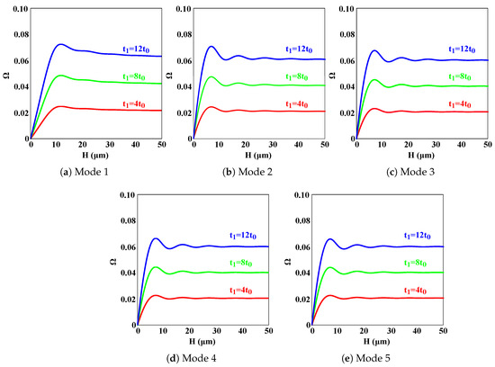 The impact of on the frequency while varying the beam thickness H and taking into account a fixed , , and for a variational mode of (a) mode 1, (b) mode 2, (c) mode 3, (d) mode 4, and (e) mode 5.