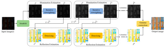- Liu, R.; Ma, L.; Zhang, J.; Fan, X.; Luo, Z. Retinex-inspired unrolling with cooperative prior architecture search for low-light image enhancement. In Proceedings of the IEEE/CVF Conference on Computer Vision and Pattern Recognition, Nashville, TN, USA, 20–25 June 2021; pp. 10561–10570. [Google Scholar]