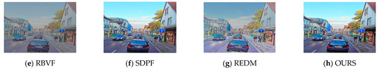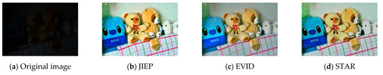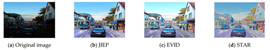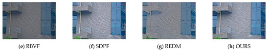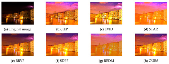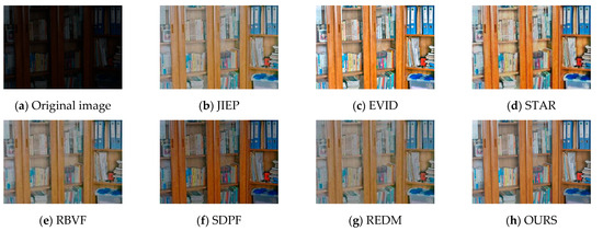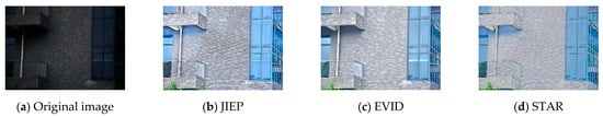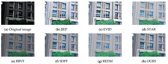 In this section, we present several experimental results. Figure 2 and Figure 3 show the visual outputs for the images “cars.bmp” and “building.bmp” using various comparison methods. As illustrated in Figure 2, the JIEP, EVID, and SDPF methods struggle to capture small details effectively, while the STAR, RBVF, and REDM methods fail to adequately suppress noise in dark areas. In contrast, our method not only enhances the dark regions while maintaining the original colors, but also effectively minimizes noise amplification in those darker areas.
