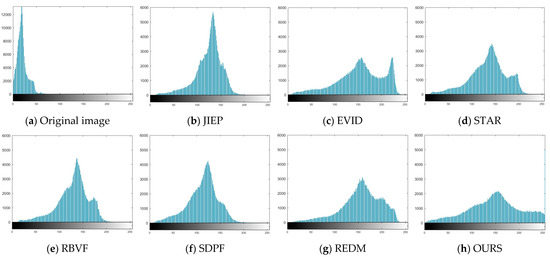Lastly, taking the resulting images of Figure 4 as an example, we plotted the histograms of all the images in Figure 8. Compared to the original low-light image and the enhancement results of other methods, the histogram of our method shows a uniform gray-level distribution, covering the entire gray-scale range (from 0 to 255). Its peak is centered, with a balanced brightness distribution that naturally presents image details while avoiding any bias toward dark or bright areas.