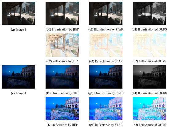 where represents the covariance, and denotes the variance of the variables in question. The correlation between illumination and reflectance can be quantified using the “Corr” metric, where lower values indicate better image decomposition quality. To verify the effectiveness of the extended decomposition method, we compare our approach with Retinex-based variational methods, including JIEP and STAR methods. The former applies edge-preserving regularization through local variation deviation, and the latter incorporates adaptive weights to enhance structure and texture perception based on Retinex decomposition. Figure 9 shows the visualization results of these decomposition methods. From the results, we observe that JIEP retains more content in the illumination component, while STAR preserves some image details in the reflectance component. In contrast, our proposed method better maintains the details in the reflectance component while ensuring that the illumination component remains piecewise smooth. In Table 4, we list the “Corr” values of the results corresponding to that in Figure 9. It is clear that the proposed method holds the least “Corr” metrics, which indicates our method outperforms other methods in decomposition performance.