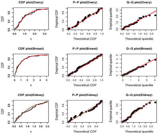 The considered dataset describes survival times of cancer patients undergoing treatment. Some of the patients receive supplemental ascorbate and others undergoing the same treatment without ascorbate supplementation. Average survival times are provided for patients treated with ascorbate and for matched controls in the following categories: Ovary, Breast, Kidney, etc. The measurements are taken from the date of initial hospital attendance for cancer treatment, near the terminal stage. Cameron and Pauling [34] and Hand et al. [35] present applications of this data set in several other contexts. The original data are presented in Table 2. For illustration purposes, we apply following transformation: , where denotes the survival times for each of the three categories: Ovary, Breast, and Kidney, respectively.