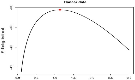 where denotes the first derivative of with respect to the associated parameters. We omit the details to save space. We can use Newton–Raphson or quasi-Newton methods to solve the likelihood Equation (4). However, we propose an alternative approach involving the profile log-likelihood function. The estimators that maximize profile log-likelihood function are identical to maximum likelihood estimators derived from the full likelihood function.