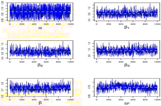 From (9), it is seen that and are both positive. Thus, the posterior density of follow gamma distribution with parameters and . The posterior density of is exponentially distributed (Equation (11)) with parameter . It may not be easy to reduce the conditional posterior distributions (10) and (12) into a known form. Therefore, we are unable to generate posterior samples directly. So we consider a Metropolis–Hastings sampling algorithm with normal proposal density for performing posterior computations. The detailed procedure of the Metropolis–Hastings algorithm is presented in the Algorithm 1.