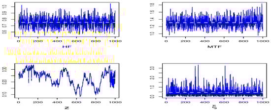 This section presents a hierarchical Bayesian approach to estimate model parameters and reliability characteristics. Furthermore, assume that follows a common independent gamma prior with hyper-parameter z and . Therefore, the joint prior of can be express as
