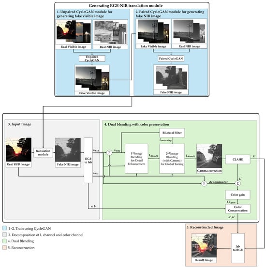 This work proposes a complementary cycle-consistent generative adversarial network (CycleGAN)-based training method, utilizing both visible and NIR images to create a sophisticated model. Given the difficulty in obtaining paired visible–NIR images for training, a sequential training strategy combining unpaired and paired image data within the CycleGAN framework is implemented. This innovative approach enables the generation of effective NIR training datasets without the need for extensive paired data collection. Then, the framework performs a two-stage mixing process between low-light visible images and virtually transformed NIR images. In the first stage, the difference in image between the visible and NIR images is calculated and used to blend the images by combining the NIR image weighted by the inverse of the difference and the visible image weighted by the difference itself. In the second stage, a bilateral filter is applied to the difference image obtained from the first stage [12], which is used to weight the visible image by its inverse and the synthesized image from the first stage by its difference [13]. This blending process is followed by additional contrast-limited adaptive histogram equalization for final image enhancement. During the fusion process between NIR and visible images, imbalances can arise between the modified luminance channel and the color channels (a and b), potentially resulting in unnatural color representation. To address this, a color adjustment method is proposed, ensuring the restoration of natural color fidelity while preserving the enhanced luminance information.