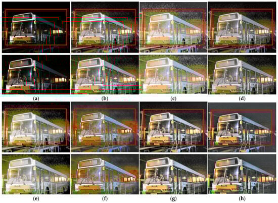 When the input image depicted a night scene, all methods except the proposed one exhibited noticeable noise in the sky. As shown in Figure 8 and Figure 9, the proposed method effectively produced a clear output for the night scene, reducing sky noise. However, despite this improvement, the proposed method introduced some white noise, which is a limitation of the synthetic NIR generation process. This effect is linked to the combination of unpaired and paired training in the proposed modules, which may cause inconsistencies during image synthesis.