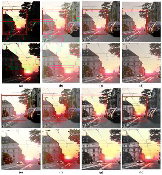 Input and result images for daytime case #2: (a) Input image, (b) iCAM06, (c) L1L0, (d) Kwon et al. [6], (e) Reinhard (2012) [8], (f) Retinexnet, (g) Kim et al. [10], and (h) proposed method.