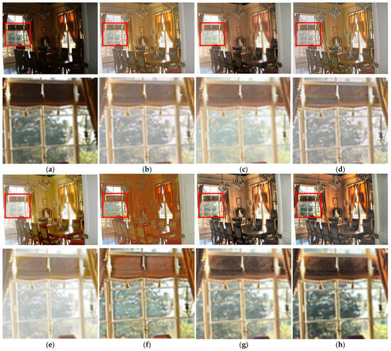 Input and result images for indoor case: (a) Input image, (b) iCAM06, (c) L1L0, (d) Kwon et al. [6], (e) Reinhard (2012) [8], (f) Retinexnet, (g) Kim et al. [10], and (h) proposed method.