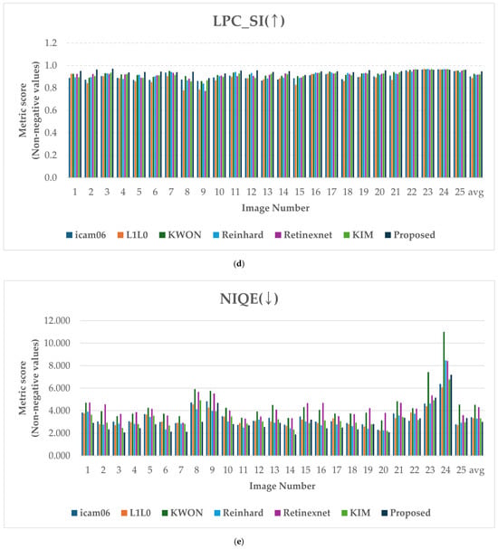 In this study, our model was trained using an unpaired dataset comprising 3300 pairs from the low-light datasets by Wei at al. [9], Jiang et al. [30], and publicly available data from the internet. Additionally, a paired dataset also comprising 3300 pairs, was used from the NIR datasets by Sa et al. [31]. The evaluation conducted a comprehensive performance evaluation of the proposed model using a range of image datasets, including established benchmark collections such as Loh et al. [32], and Meylan et al. [33,34]. To rigorously assess the effectiveness of this approach, we compared the results with several existing tone-mapping algorithms under different imaging conditions. The experimental setup involved testing various image types to address specific challenges: low-light scenarios to evaluate tone compression in both bright and dark regions, outdoor scenes to assess detail preservation, and color-rich environments to examine both color reproduction and tone compression simultaneously. Image processing was performed on images with dimensions of 1312 × 2000 pixels, resulting in a processing time of 2.29 s per image. The evaluation was carried out on a Windows 10 Education 64-bit system with an Intel(R) Core™ i7-9700K CPU @ 3.6 GHz, a TITAN RTX (NVIDIA, Santa Clara, CA, USA), and 96 GB of DDR4 memory, utilizing Python 3.8 and MATLAB R2020b for computational analysis. The training module was configured with a batch size of 1000 epochs and a learning rate of . Through comparative analysis, we found that existing methods such as Reinhard and L1L0 tended to apply a uniform tone increase across image regions, resulting in a lack of dynamic detail. While methods like iCAM06, Kwon et al., Retinexnet, and Kim et al. maintained visibility in dark scenes, they introduced noticeable color distortions. These included unnatural saturation levels and an overall reddish color cast, especially in Retinexnet. In contrast, the proposed method outperformed these alternatives by effectively compressing tones in detailed regions. Specific elements, such as buses, transmission towers, cars, windows, and road surfaces, exhibited nuanced and accurate contrast representations. This allowed our approach to preserve and emphasize critical structural and textural information with remarkable fidelity, producing a balanced and natural visual output.