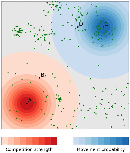 Visualization of the kernels describing competition and dispersal. Individuals are represented by points in a two-dimensional habitat. The strength according to which an individual A competes with individuals such as B is determined by the competition kernel, depicted here by variations in red shading. Similarly, the probability density according to which an individual C moves a newly produced offspring individual to locations such as D is determined by the dispersal kernel, depicted here by variations in blue shading.