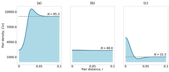 Solutions of the equilibrium equation. The continuous blue curves show the pair density as a function of the pair distance . The dashed gray lines indicate , i.e., the limit of as r approaches infinity. (a) , ; (b) ; and (c) , . The smaller the ratio , the smaller the mean density N. Other parameters: , , , , and .