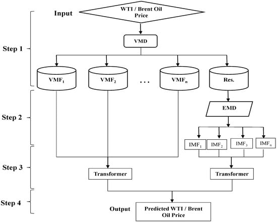 This subsection presents the combined model prediction construction method based on the VMD decomposition and the associated implementation steps. We employ a multistep approach integrating the VMD and EMD decompositions with a Transformer model to forecast the WIT and Brent crude oil prices. As shown in Figure 1, the proposed Transformer method based on VMD consists of the following four steps: