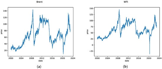 In this study, the daily closing prices of West Texas Intermediate (WTI) crude oil futures and the Brent crude oil futures traded in the New York Mercantile Exchange (NYME) are used and the data are obtained from the US Energy Information Administration (EIA). The sample period extends from 4 January 2000 to 30 December 2022. The sample data are divided into the training set and the test set in the ratio of 7:3. That is, the data in the interval from 4 January 2000 to 31 December 2015 are used as the training set, and those in the interval from 4 January 2016 to 30 December 2022 as the test set. The WTI crude oil futures price series contains 5773 sample points, while the Brent crude oil futures price series contains 5769 sample points. The descriptive statistical results of the WTI and Brent crude oil price series are shown in Table 1. This paper utilizes the sequential validation method, as in the field of machine learning, cross-validation is commonly applied for assessing models based on static data. In contrast, sequential validation tends to be employed for time series data.