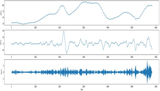 This paper uses VMD decomposition to process the original series according to the determined number of decomposition modes, and the residual series is obtained by subtracting the modal components after VMD decomposition from the original series. According to the mode components VMF0-VMF2 listed in Table 2 and the statistical information of the residual, we can find that the Pearson correlation value and Kendall correlation value of the residual series are higher than those of VMF2, which further proves that the residual contains pertinent information regarding the original signal. The EMD is utilized in this paper to prevent information loss and forecast the previously disregarded residual series due to its intricacy. The mode components of the post-EMD residual series are illustrated in Figure 3 and Figure 4. The decomposition results reveal that after EMD, the residual series is decomposed into three IMF signals (IMF1–IMF3). The IMF mode components are arranged from low to high frequency, with IMF1 exhibiting the lowest fluctuation frequency and IMF3 displaying the highest. After the secondary decomposition, the residual mode components show lower nonstationarity and complexity; thus, utilizing these modal components for forecasting crude oil prices can result in higher accuracy.