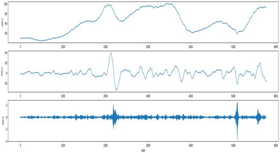- Step 2: Extract the IMF: First, initializeto obtain the extremum points of , perform cubic spline interpolation on the series of , gain the upper and lower envelopes of , and then defineIf meets the standard of IMF, setOtherwise, let jump back to Step 1 to obtain the extremum points of .