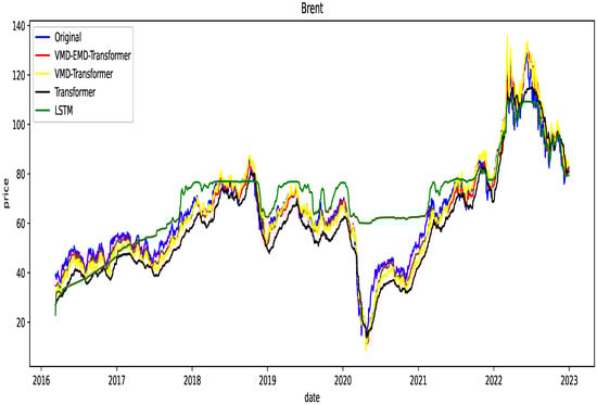 Comparison of actual and predicted Brent crude oil prices using the VMD–EMD–Transformer and baseline models.