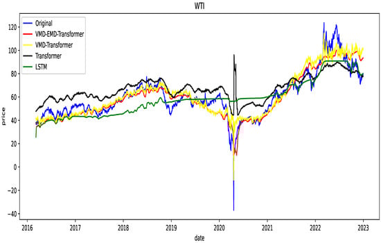 Comparison of actual and predicted WTI crude oil prices using the VMD–EMD–Transformer and baseline models.