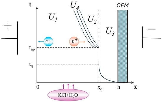 At the same time, the study of non-stationary transfer of a binary electrolyte in a diffusion layer is interesting in that it allows one to determine the structure of the diffusion layer and its change over time, which is necessary, for example, for the asymptotic analysis of problems, the establishment of simple engineering calculation formulas for the dependence of the distribution of concentration, and the determination of electric field strength on the parameters of the problem. The studies of non-stationary problems are considered in [15,16]. In these works, main attention is paid to the over-limit potentiodynamic mode and the analysis of the settling time depending on the parameters of the problems. The works [16,17] consider “shock electrodialysis”—a recently developed method of water desalination in microscale pores near an ion-selective element, in which a deionization wave propagates through a microchannel or a porous medium with a sharp boundary between the concentrated and depleted zones. Deionization waves can be compared with a charge wave, since the deionization region actually coincides with the SCR. In contrast to “shock electrodialysis”, this work studies the depleted diffusion layer near the ion-exchange membrane, which has macroscale dimensions of the order of millimeters.