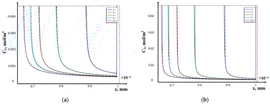 Distributions of cation concentrations in the extended SCR calculated numerically (solid lines) and using the asymptotic solution (20) (dashed lines) at a current density at time moments: 3 s, 4 s, 5 s, 6 s, 20 s for the initial concentration of the electrolyte solution C0 = 1 mol/m3 (a) and C0 = 10 mol/m3 (b).