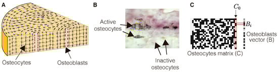 Model of cellular automata in a compact bone. (A) A scheme of a compact bone, where the osseous tissue is mostly arranged in cylinders of concentric lamellae (osteons) around a central canal (Haversian canal) containing blood vessels. Osteocytes are disposed radially, converging towards Haversian canals. They are regularly placed throughout the mineralized matrix in cavities named lacunae and are connected to each other by means of thin cytoplasmic processes termed canaliculi. In this manner, osteocytes make up a highly interconnected network. (B) Empirical evidence suggests that osteocytes can be in two different states regarding sclerostin production. Active and inactive osteocytes appear stained in different colors in anatomical preparation [8]. (C) Based on A and B, we model the interactions between osteocytes within the framework of cellular automata assuming that osteocytes are disposed in a two-dimensional region, and that they may be active (in white, and label them as 1) or inactive (in black, and label them as 0) depending on whether they produce sclerostin, a protein that inhibits the starting of bone remodeling. The cellular automata model assumes that osteocytes can change their stage depending on the number of neighboring cells that are active at any time. Adapted from [8,9].