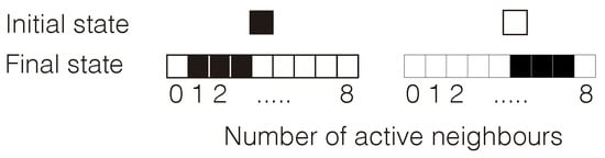 We assume that each osteocyte is under the influence of its eight nearest neighbors only. A transition rule can be described as an array of zeros and ones of length 18. The first (respectively, last) nine positions indicate the transition of inactive (respectively, active) osteocytes that have zero to eight active neighbors. A particular illustration of this type of rules is provided in Figure 2.