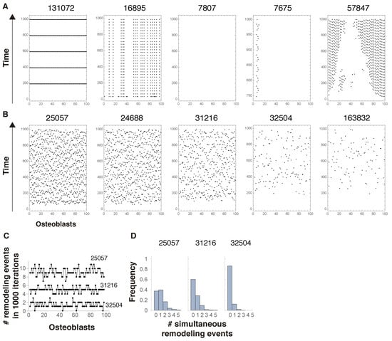A different behavior is represented by rule 16,895 in Figure 3A. In this case, some osteoblasts trigger periodic remodeling events, but most of them are never activated. This pattern of osteoblast activation does not simulate the required dynamics of bone remodeling, since large regions of the bone are never scanned. Other transition rules (7807, 7675 or 57,847 in Figure 3A, for instance) also give rise to non-realistic mechanisms of bone remodeling.