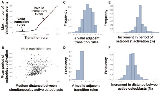 Figure 4C,D show the probability of obtaining a valid or invalid rule by slightly changing a valid rule. The mode of the distribution of valid neighboring rules is five, while that of invalid rules is eight. The latter means that an admissible algorithm may perform poorly when comparatively minor modifications in its transition rules are introduced, which could hint at the appearance of disorders such as osteoporosis or osteopetrosis. In Figure 4E, we can see that modifications in transition rules often lead to small changes in the period of osteoblast activation. This means that it is possible to slightly perturb a transition rule to achieve a slightly faster or slower mechanism of bone scan. Similarly, transition rules can be modified so that the fraction of osteoblasts that are active at the same time is scarcely altered (Figure 4F).