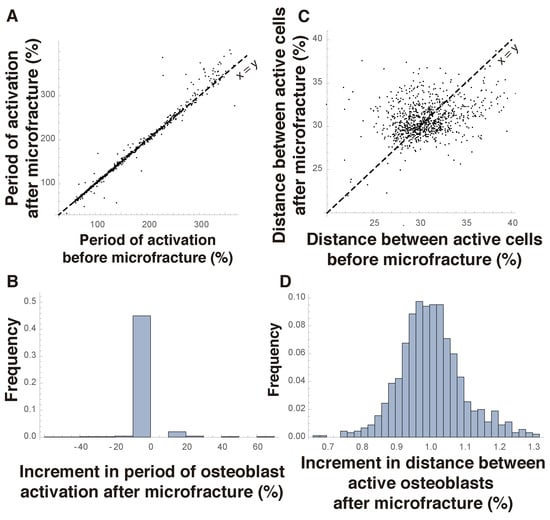 Effect of microfractures on the proposed mechanism of bone scan. (A,B) Change in the period of osteoblast activation caused by microfractures. The mechanism of bone scan is robust and does not lead to substantial changes in the period of bone remodeling in case of microfractures. (C) The mean distance between active osteoblasts is more sensitive to microfractures. However, most of the changes in this distance are small, as shown in (D).