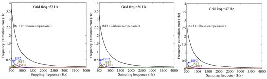 The selection of the number of Maclaurin series terms for the ISF depends on the sampling frequency and involves a tradeoff between detection accuracy and computational effort: a higher number of terms results in lower frequency estimation error, but increases the computational effort. This relationship is clearly illustrated in Figure 1, where ISFn () represents the consideration of the first n terms of the ISF Maclaurin series for correcting the frequency estimation error of the traditional method. Notably, ISF1 corresponds to the traditional method without any error compensation. As indicated by the results in Figure 1, considering the first four terms of the ISF Maclaurin series (ISF4) appears to be sufficient for correcting the frequency estimation error at low sampling frequencies.