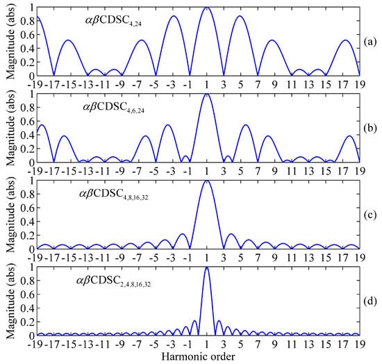 Based on its delay factor, each DSC operator can block certain harmonics. Therefore, to deal with real grid scenarios, cascading multiple DSC operators with appropriate delay factors is often required. Table 1 summarizes different combinations of DSC operators for various grid scenarios and Figure 5 shows their Bode magnitude plots. Notice that operator denotes the cascade connection of m DSC operators with delay factors . It should be emphasized here that all these combinations have the operator in common and, therefore, all of them can block the FFNS component of the grid voltage.