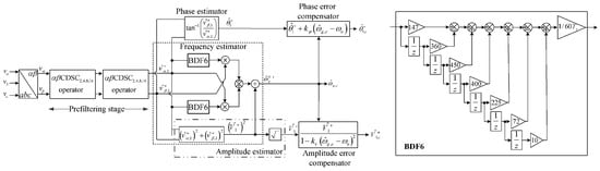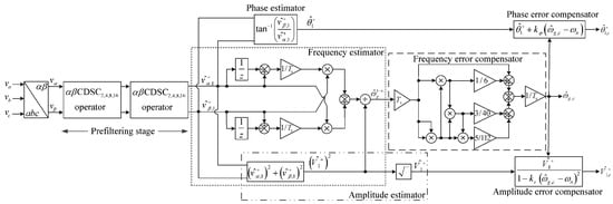 Providing an accurate estimation of the grid voltage phase, frequency, and amplitude is extremely important in a wide variety of applications, including distributed generation (DG) systems and microgrids, high-voltage direct current systems, flexible alternating current transmission systems, and power conditioning systems, and in the monitoring and protection of power systems [1,2,3,4,5]. For instance, in DG systems and microgrids, knowledge of the grid phase, frequency, and amplitude is required for a seamless transition from islanding mode to grid-connected mode, as well as for islanding detection [6]. In power systems, accurate frequency detection is crucial for the operation of frequency relays (responsible for over- and under-frequency protection) and for the automatic control of turbines and generators [7].