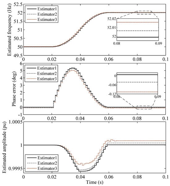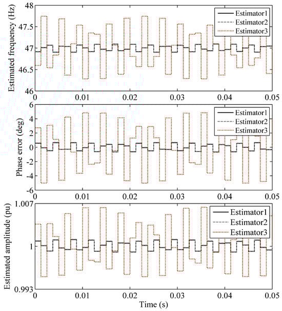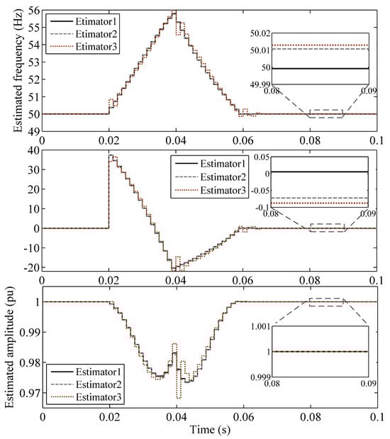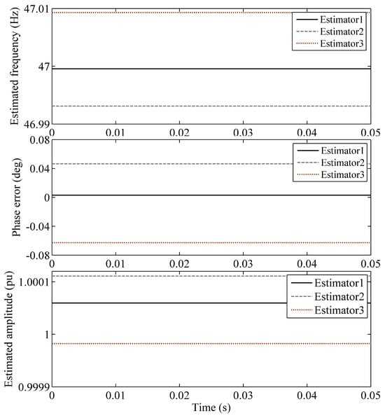 Figure 10 and Figure 11 show the obtained results for Test Cases 1 and 2, respectively. It can be observed that all estimators, particularly Estimator1, provide good steady-state detection accuracy. From the perspective of dynamic response, all three versions exhibit similar performance and reach steady-state after approximately two cycles of the nominal frequency.