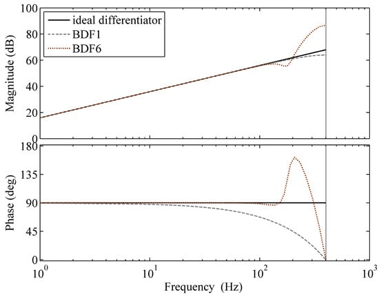 Frequency response of the BDF1-based and BDF6-based approximate differentiators and the ideal (continuous) differentiator.