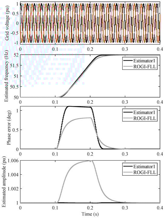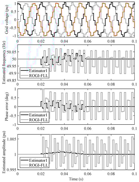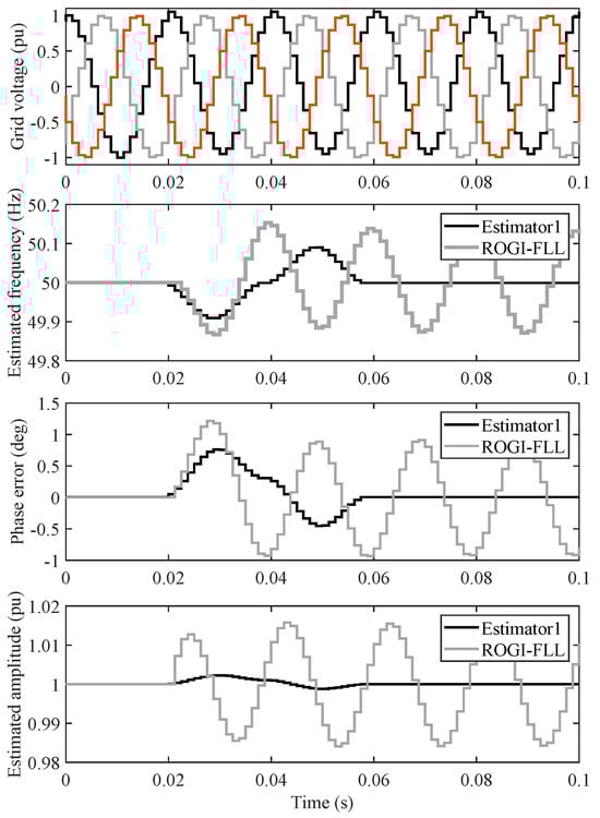 - Estimator1 effectively filters dominant harmonics of orders −5 and +7. In contrast, ROGI-FLL suffers from large harmonics at six times the fundamental frequency in this condition (see Figure 18);