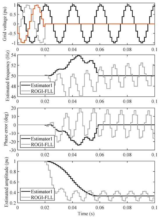 - Estimator1 effectively handles unbalanced grid scenarios with a fast dynamic response. However, ROGI-FLL suffers from large double-frequency oscillatory errors under this condition (see Figure 17);