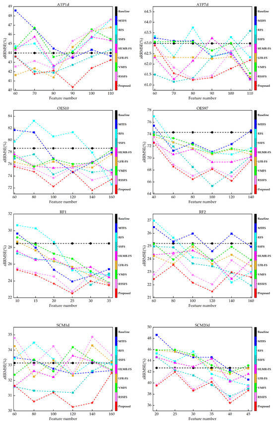aRRMSE results compared with compared methods under different number of selected features.