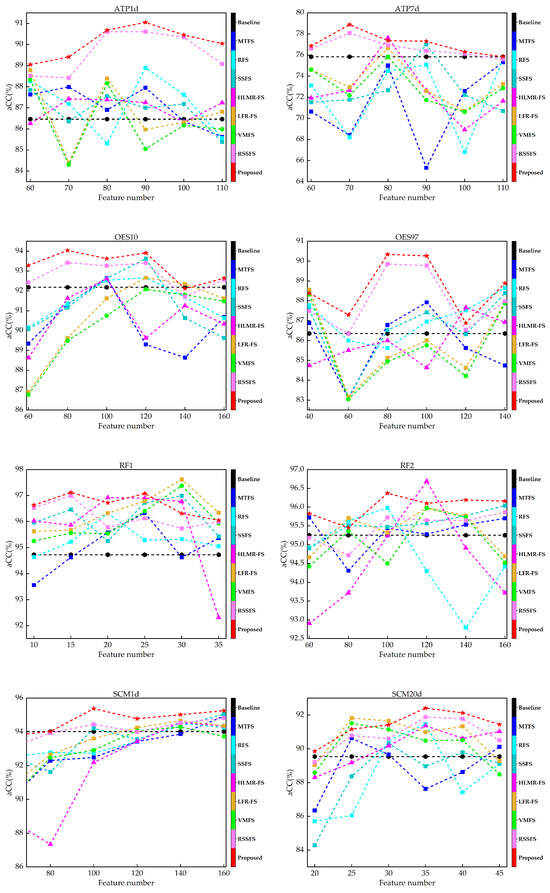 aCC results compared with state-of-the-art methods under different number of selected features.
