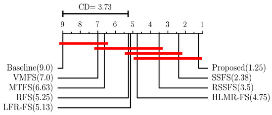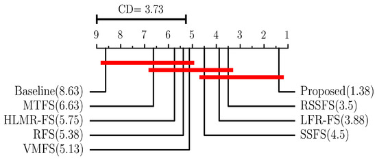 Meanwhile, the best aCC and aRRMSE values of compared MTFS methods on various datasets are ranked, and the average rank of different methods on all datasets is calculated. The Friedman test [50] with the significant level is employed, and we utilize Bonferroni-Dunn test [50] as the post hoc test to further analysis of the comparison. The critical difference (CD) is calculated to measure the difference between the proposed method and other algorithms. The calculation of CD is as follows: