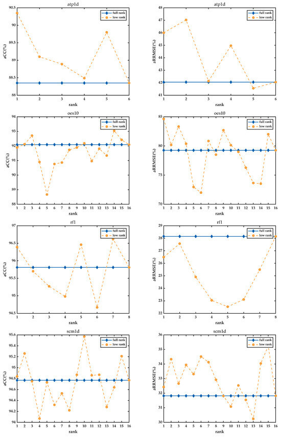 We also investigate the influence of different ranks over different data sets, set . The performance when is taken as the performance of the algorithm at full rank, on account of the condition . The number of input features d in the adopted data set is much larger than q, so the corresponding rank value of the regression matrix at full rank is q. We set in the ATP1d; in the OES10; in the RF1; in the SCM1d. By setting different values of r to impose low-rank constraints on and . The fluctuations of aRRMSE and aCC values of the algorithm with fixed are shown in Figure 5.