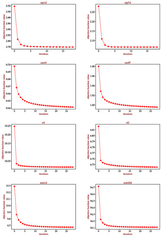 We also plot the convergence curves of the objective function value of Equation (12) when the algorithm is updated iteratively on different data sets. As shown in Figure 8, it can be observed that ATP1d, ATP7d and RF1 can converge to the optimum within 20 iterations. The rest of the datasets can converge within 30 iterations, and the objective function converges quickly in the first few iterations. It indicates that the proposed alternating optimization algorithm can efficiently converge to the global optimum. Moreover, the monotone decrease of the objection function value demonstrates that the proposed problem can converge well. It confirms the effectiveness of the alternating optimization algorithm in addressing the proposed problem.