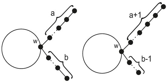 Pendant edge-moving transformation of a connected graph G. Let and let G be a connected graph with an induced path (induced subgraph that is a path) , in which only one internal vertex has a degree of at least 3. Let a be the number of vertices of on one side of w, and b the number of vertices on the other side, see Figure 1. By moving a pendant vertex from the side of a path to its side, we perform a so-called pendant edge-moving transformation of G.