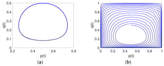 Given the set parameters, the equilibrium point in System (1) can be solved as . Assume that p and q are both 0.5, then the evolution curves of Systems (1) and (2) are shown in Figure 2a,b, respectively. Figure 2 shows that neither System (1) nor System (2) are evolutionarily stable at the equilibrium point . What is more, the curve of System (1) is a closed-loop line in Figure 2a, whereas System (2) is a time-delay replication dynamic system, and it does not evolve towards equilibrium, confirming that under the static mechanism, the stability of enterprises and regulators is not affected by the delay .