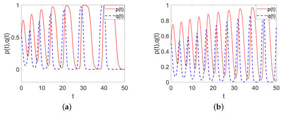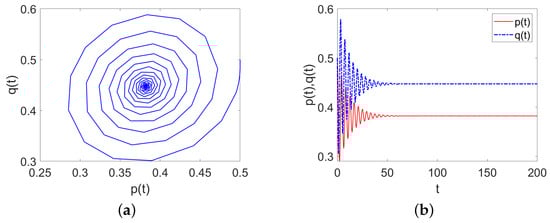 (a) Evolution curve of System (8) when , ; (b) The evolution progress of p and q as t changes.