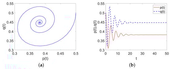 (a) Evolution curve of System (9) when ; (b) The evolution progress of p and q as t changes.